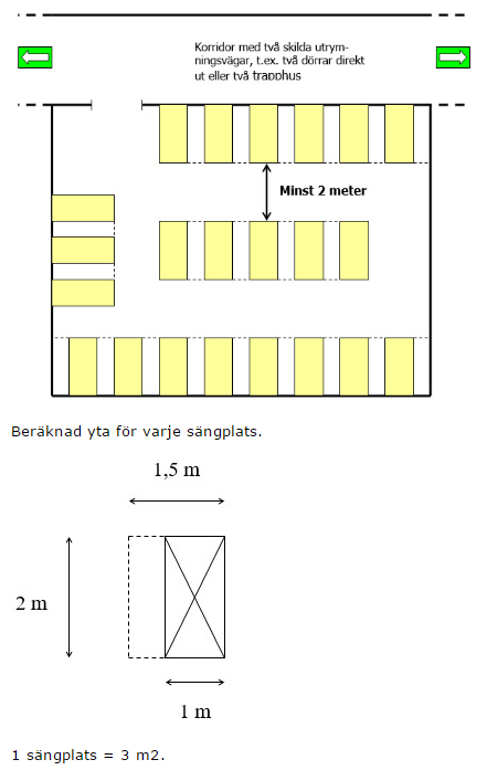 Förslaget är att sängplatserna placeras ut så att utrymningsvägarna tillgodoses och därefter bestäms personantalet.